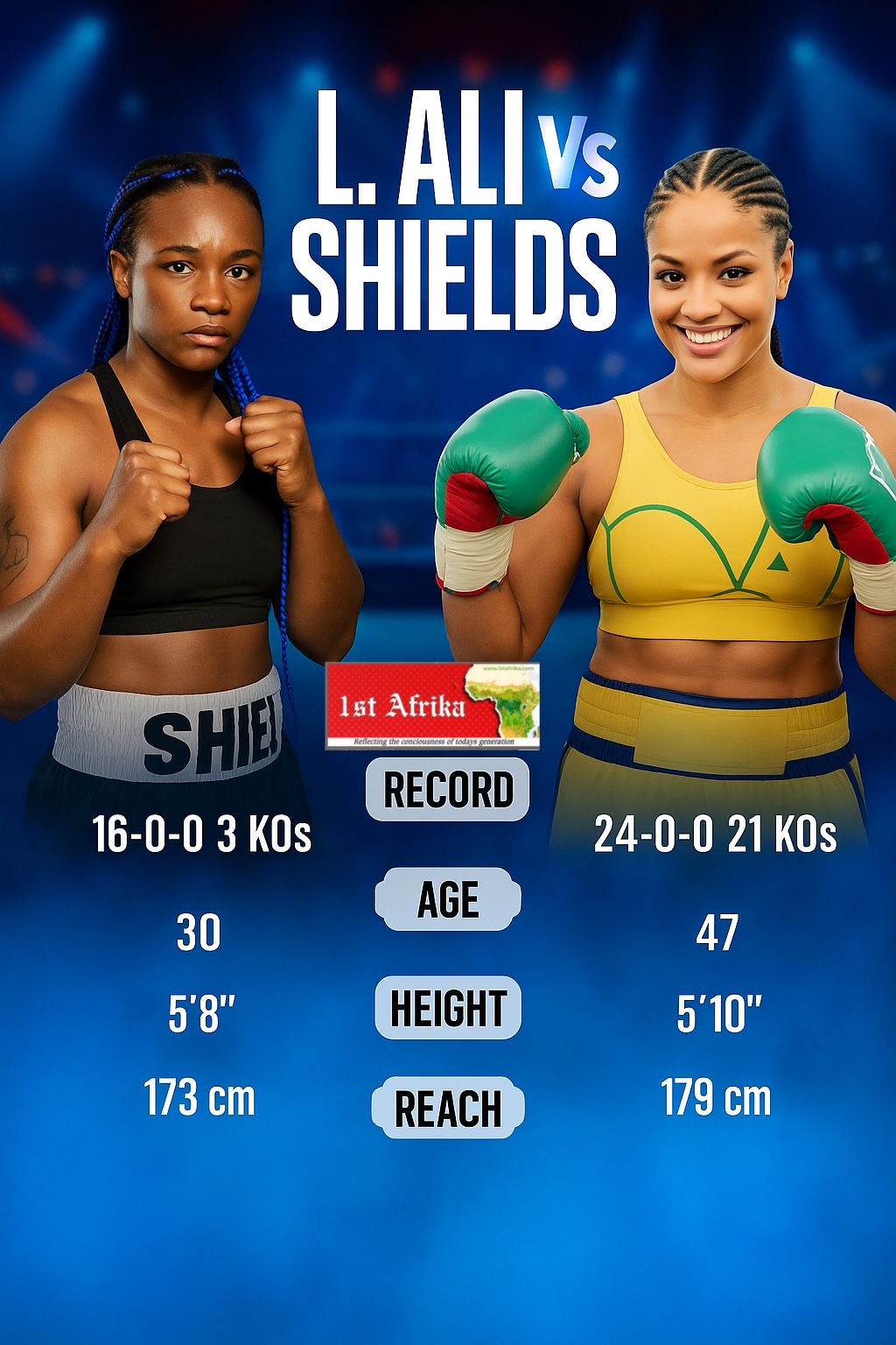 On paper, the matchup is mythical. Laila Ali towers slightly in height and reach, standing 5’10” with a 179 cm reach, while Shields, at 5’8” and 173 cm, counters with speed, compact technique, and a youth advantage. At 30, Shields is arguably in her prime, her engine still turbocharged by years of relentless competition and training. Ali, at 47, enters as the elder stateswoman, but with power that has aged like fine wine, her knockout ratio testament to her punishing fists.