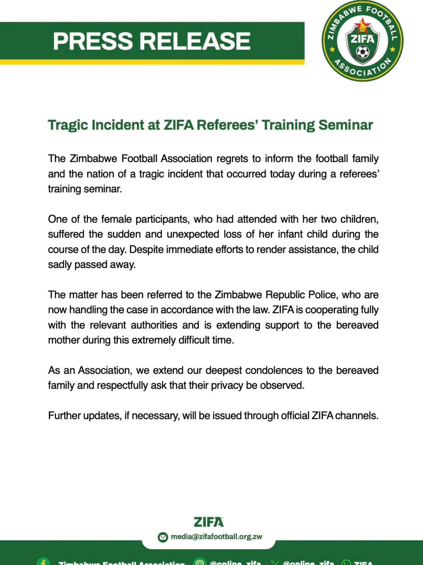 A Zimbabwe Football Association (ZIFA) Referees’ Training Seminar held this Wednesday was overshadowed by tragedy, following the sudden and tragic death of an infant who had accompanied one of the participants.